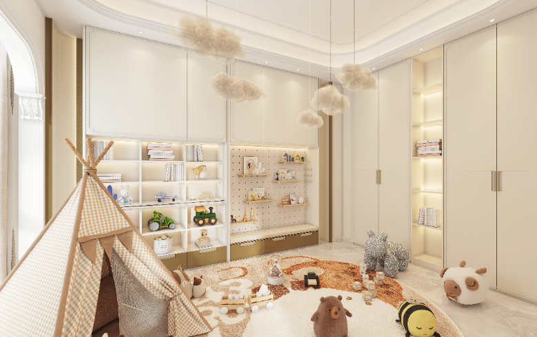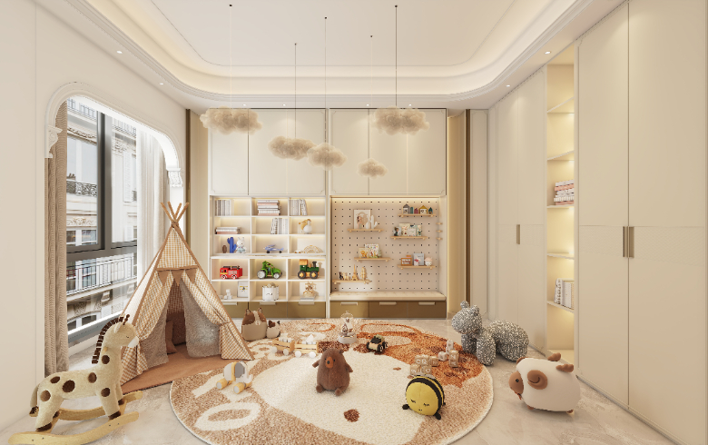 玩樂區放滿各種洋娃娃,守護天真爛漫的童年。暖色調現代感的兒童房,大面積的落地窗,明快的配色,既能培養孩子開闊的胸襟,也有利于增加他的擴散性思維和創新意識。