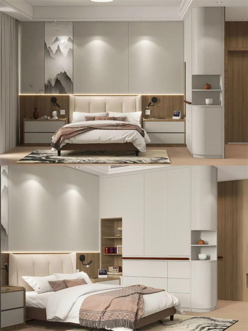 ??床頭護墻板融入山水畫,更符合爸媽審美,裝內嵌感應燈,方便夜間起床。