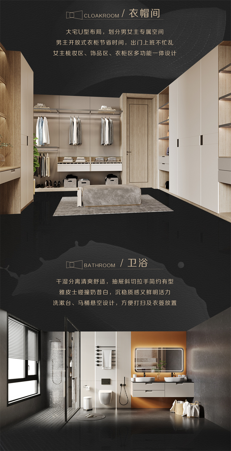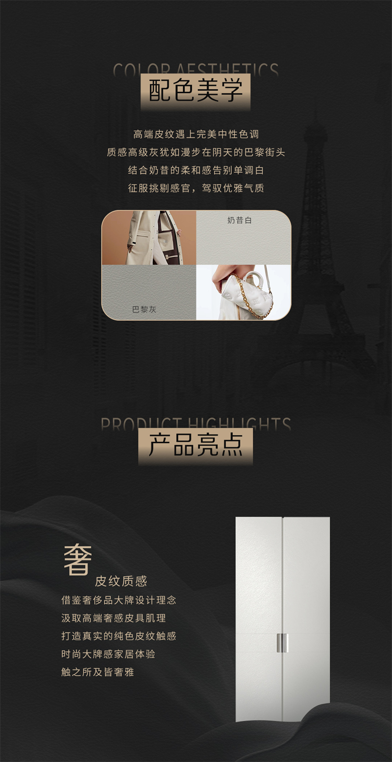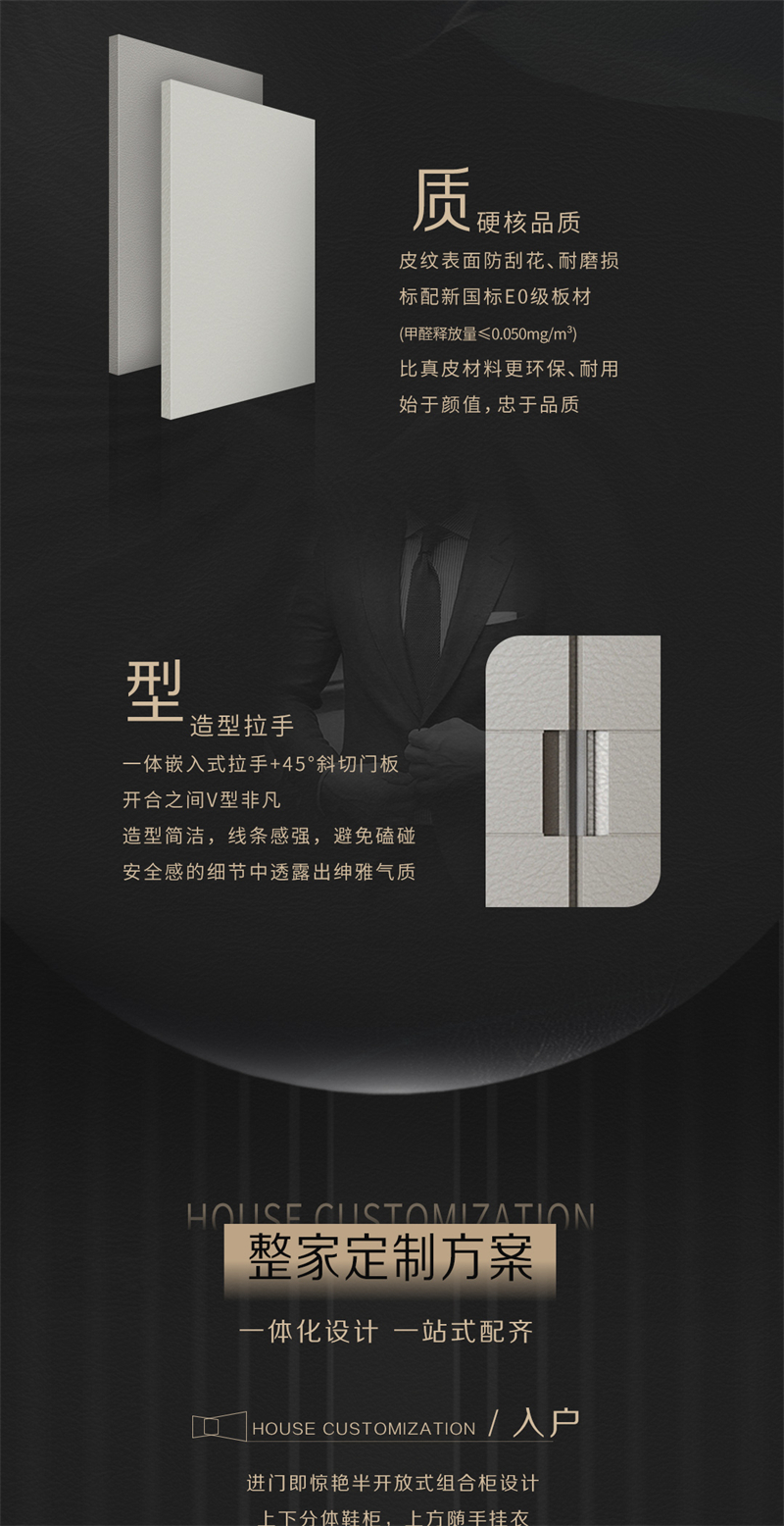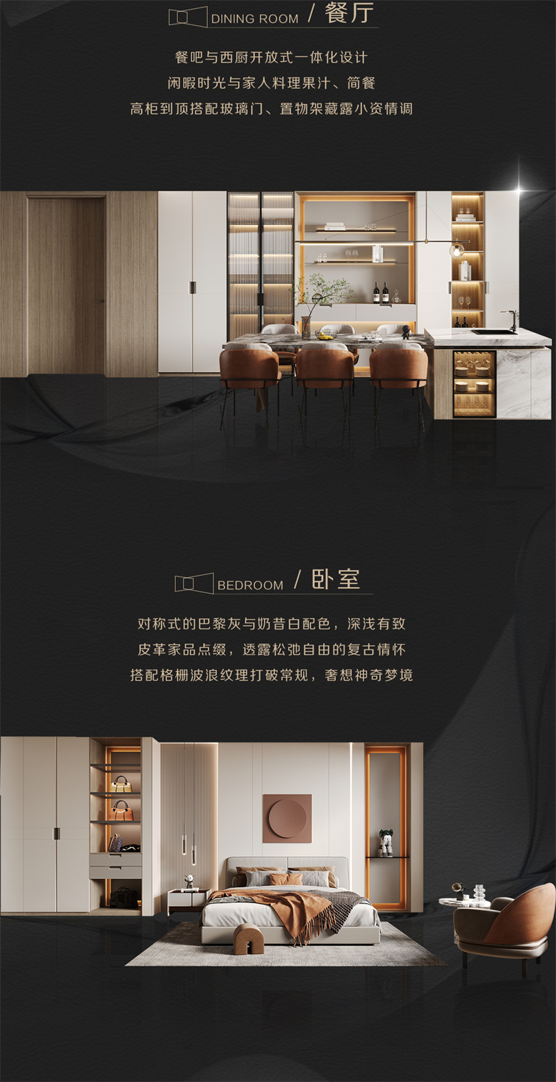 靈感來源于皮具奢侈品Hermes和LV 提取“H’元素勾勒門板簡潔腰線 結(jié)合'V'元素塑造門縫立體造型 采用高端皮質(zhì)肌理打造極簡造型門板 簡奢有度優(yōu)雅有品的生活拉開帷幕