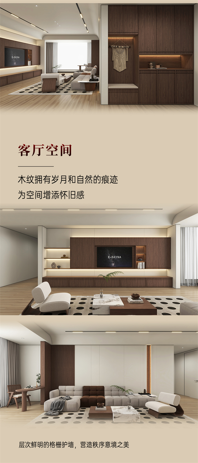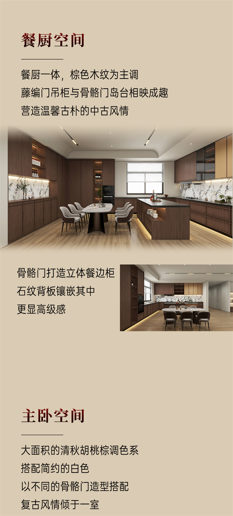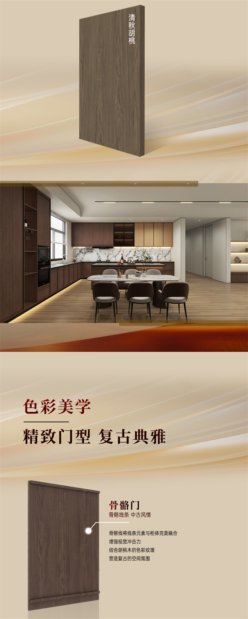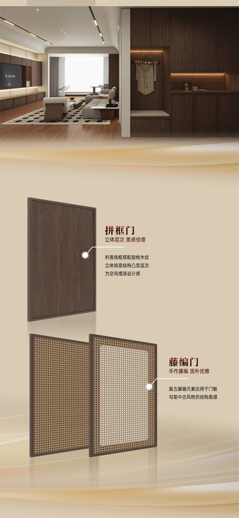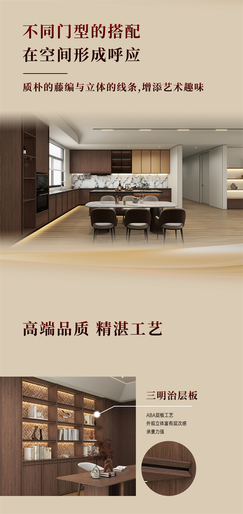 棕色胡桃木紋為主色調,搭配白色暗紋,細膩的藤編門與硬朗的骨骼門讓人聯想到古老的家具,