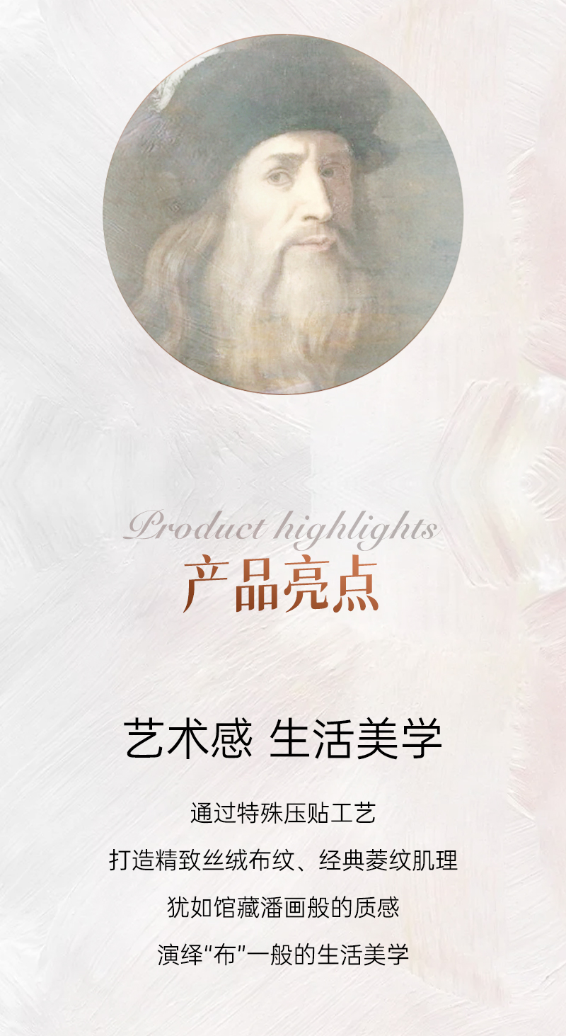 通過(guò)特殊壓貼工藝,打造精致絲絨布紋、經(jīng)典菱紋肌理,猶如館藏潘畫(huà)般的質(zhì)感,演繹“布”一般的生活美學(xué)