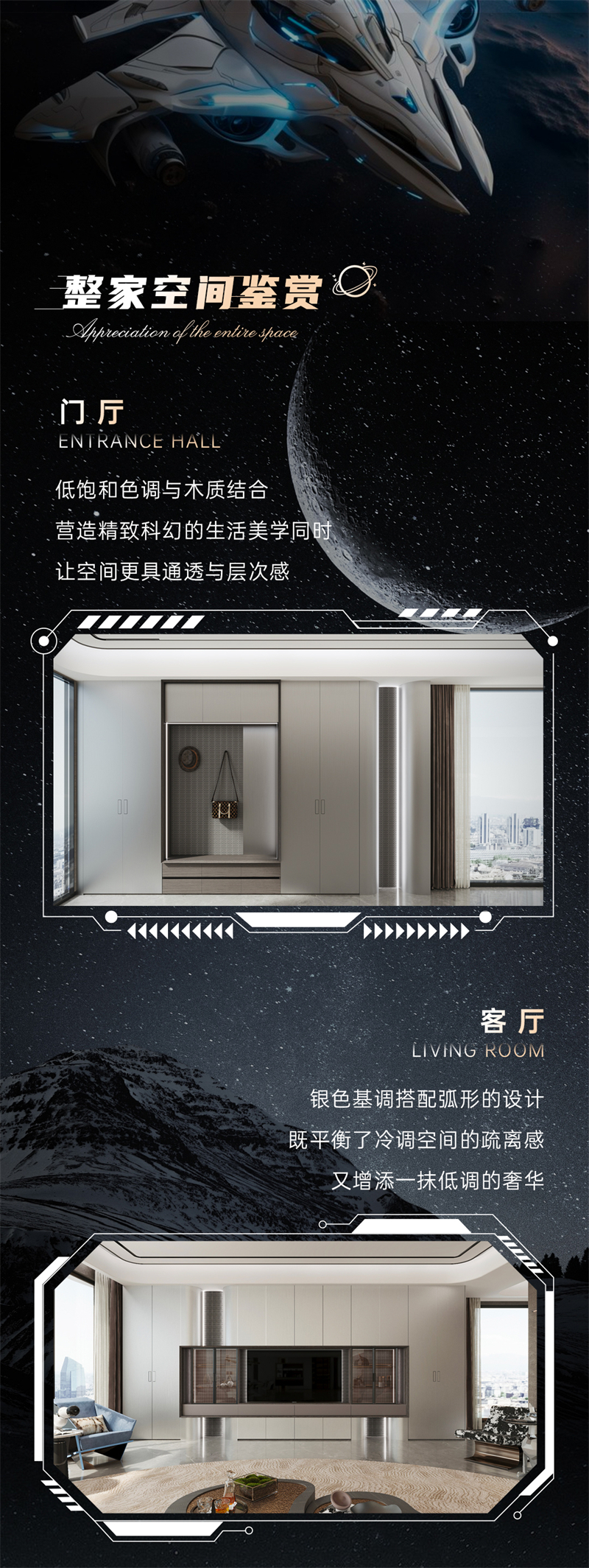 以科技青年(航天設(shè)計(jì)師、汽車(chē)工程師、科技創(chuàng)業(yè)者等)職業(yè)特性為核心,融入航天元素與汽車(chē)模型展示,借助流暢線(xiàn)條、科技燈光,搭配智能家居,營(yíng)造未來(lái)感氛圍,滿(mǎn)足對(duì)科幻的遐想,實(shí)現(xiàn)科技與生活的融合,展現(xiàn)探索精神。