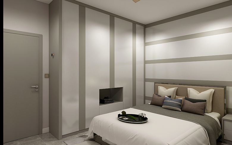 采用尼泊爾柚木+深灰風之谷的撞色創意搭配方案,色系深淺結合,空間線條感及幾何造型強烈,既不顯得單調,又具空間層次感。