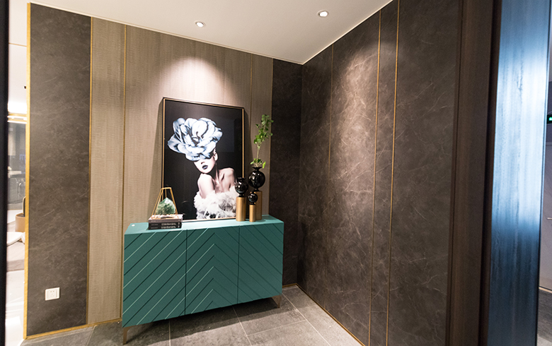 門廳護墻系統(tǒng)徜徉在經(jīng)典與現(xiàn)代之間,行走在時尚的天平上。金屬黃銅線裝飾與木質(zhì)天然紋理渾然一體,彰顯著華貴的生活氣息,低調(diào)而奢華。