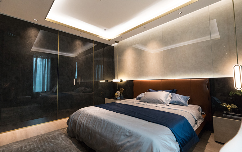 臥室護墻系統(tǒng)兩面采用深淺對比色,高亮光護墻板拼接,非對稱均衡設計,幾何線型簡雅觀感,造就輕快、高雅、奢華的生活品味。
