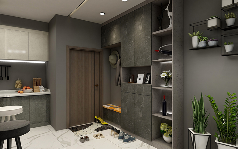 以黑白灰為主體色,的極簡風格家居設計,配上一部分深色木紋,緩和空間色調。凸顯出簡約而不簡單的現代簡約風格設計。