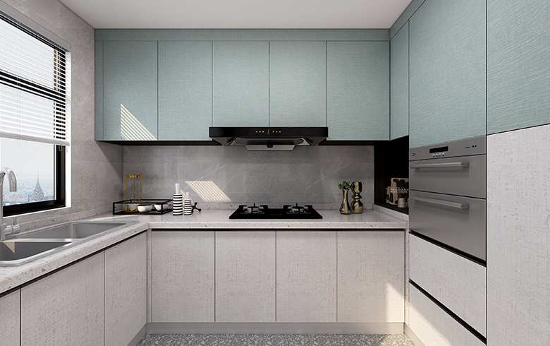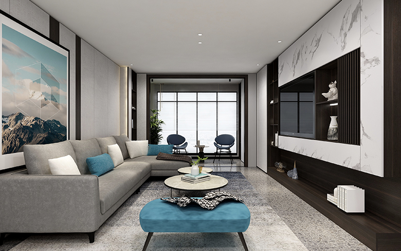 該方案為極簡系列,現代風格。本方案設計靈感來源于鴉頭棕雀的鳥巢,整體空間以木紋色為主,采用淡藍色為輔助色作為點綴。空間戶型面積約為103m2,大致分為客餐廳、陽臺、廚房、衛生間、主臥、次臥以及書房。動靜分區,互不干擾。整個客餐廳色調有淺灰、黑色兩個色調,視覺上顯得統一。廚房設計為L型。主臥床頭背景設計兩層,第一層與柜體顏色相呼應;第二層與柜門顏色呼應。顏色統一,層次與立體感強;通過橙色調進行點綴,增加空間的靈動性。次臥的主色調是淺灰色,是深受現代主流的配色,給人一種親近的感覺。書房背景以淺色與護墻的顏色統一,但橙色最為點綴,不會顯得單調沉悶。