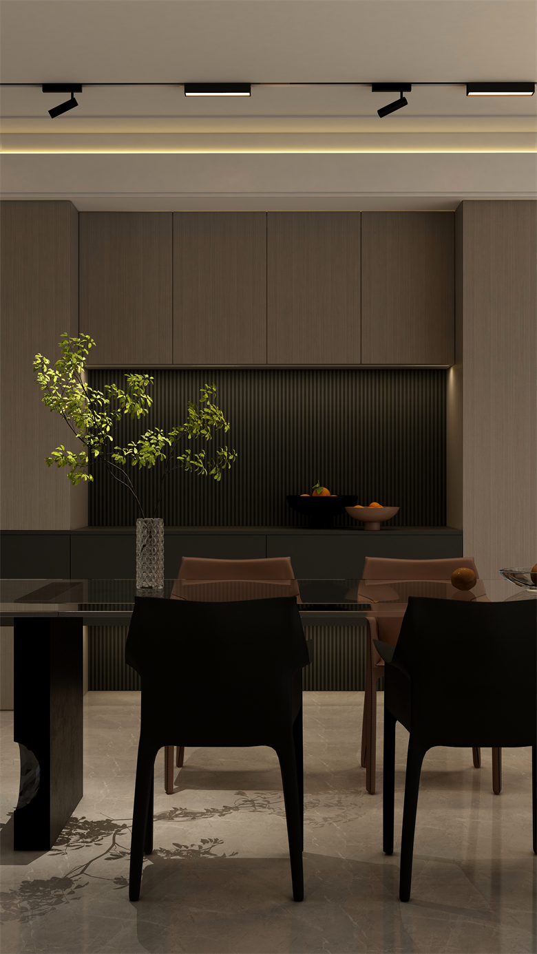 本案設(shè)計(jì)圍繞業(yè)主意式極簡風(fēng)格的需求,主色調(diào)黑、白、灰、咖,多利用金屬色、木色、石材做出變化,點(diǎn)綴少量艷麗色。柜墻門一體化,采用穿插、進(jìn)退等設(shè)計(jì)手法,配合燈光使空間簡潔又頗具設(shè)計(jì)美感。意式極簡風(fēng)格刪繁就簡,遠(yuǎn)離一切浮華和不實(shí)用,從生活本質(zhì)出發(fā),以極簡的設(shè)計(jì)演繹出最本質(zhì)的輕奢美學(xué)。