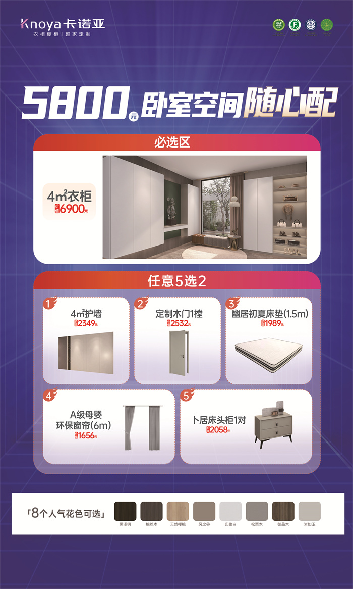臥室空間隨心配5800元套餐,必選4㎡定制衣柜,8個時尚花色可選,分別是黑澤明、棕絲木、天然櫻桃、風之谷、印象白、松栗木、御品木、巖如玉。套餐中可以自由選擇的產品包括4m護墻、1樘定制木門、1.5m護脊床墊、6米A級母嬰環保窗簾、1對床頭柜(5選2),一個套餐僅需5千多元,就能將柜、墻、門等產品一站配齊,真正實現“一家搞定,一價配齊,一體設計”。