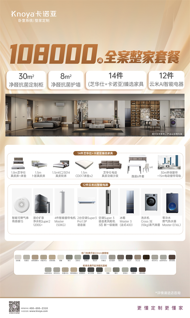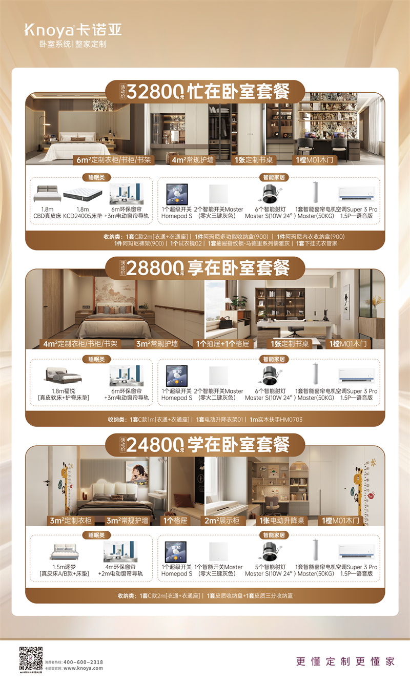 本次活動(dòng),卡諾亞還特別推出32800元忙在臥室套餐、28800元享在臥室套餐、24800元學(xué)在臥室套餐等,涵蓋臥室系統(tǒng)+整家定制2大品類,包含定制柜、護(hù)墻板、全屋家具及智能家電,同時(shí)攜手芝華仕、CBD、云米科技等多個(gè)高端品牌,致力于為消費(fèi)者打造舒適、便捷且極具品質(zhì)感的理想臥室空間。