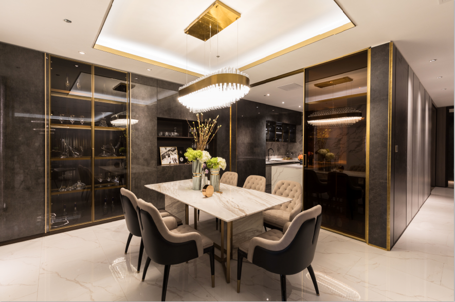 廚房和餐廳一體化設計,高亮光門板一板到頂,空間更顯大氣,黃銅金屬線條的點綴,讓就餐多了一份奢麗。餐廳緊挨著廚房,拿取美食也較為方便。歐式靠背的椅子更有著獨特的人文韻味,輕奢格調的設計,不僅讓就餐多了一份藝術感和儀式感,還會讓人心情大好,胃口也會大開。