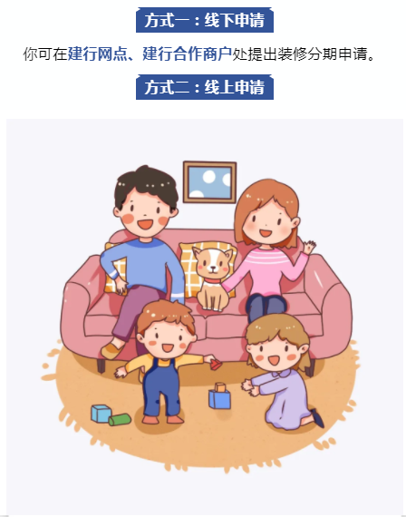 你在線上、線下亦可申請報名裝修分期,并向建行工作人員提交身份證、房產(chǎn)證明等相關(guān)資料。