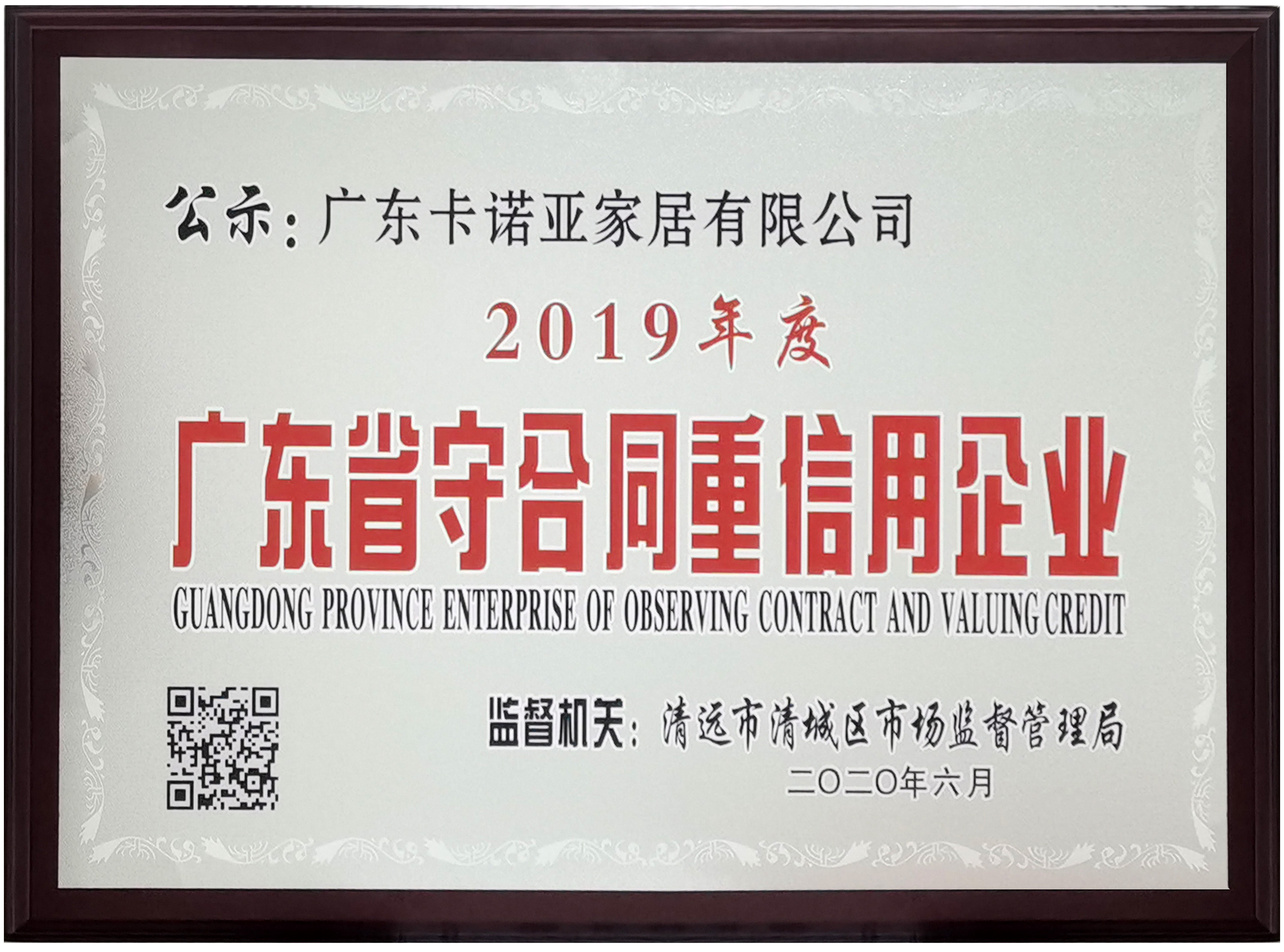 近日,廣東省清遠市清城區市場監督管理局對廣東省守合同重信用企業進行公示,廣東卡諾亞家居有限公司憑借良好的信譽與契約精神,依靠19年來的誠信經營與優質服務,順利通過最終評審,獲得“2019年度廣東省守合同重信用企業”殊榮,這是對公司誠信管理的高度肯定和誠信服務的極大鼓勵。
