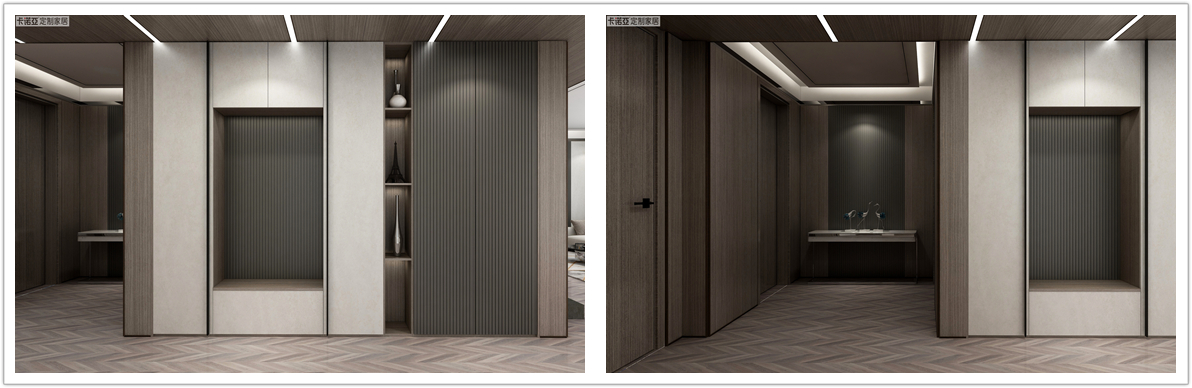 墻面以木紋為基礎,搭配卡諾亞“慕尼黑”凹凸格柵護墻板,豐富了空間的層次感。方正對稱的結構設計,柜體墻面一體化,視覺上整體統一。