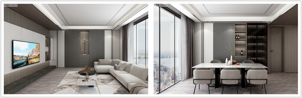 卡諾亞“銀絲木”大面積運用,“慕尼黑”格柵門板作為點綴,搭配米色的沙發和白色大理石餐桌,整個空間硬朗有張力,凸顯現代都市生活注重快節奏與簡潔實用。