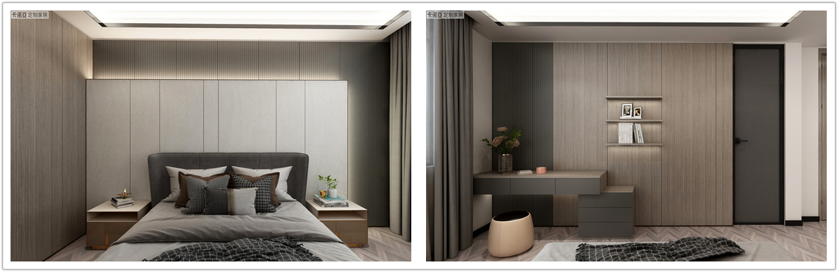 米色成為空間的主色調,輔以木紋材質,自然而舒適,營造良好的睡眠環境?;丶y型金屬條及黃銅色拉手點綴空間,盡顯新中式風格的輕奢觀感。
