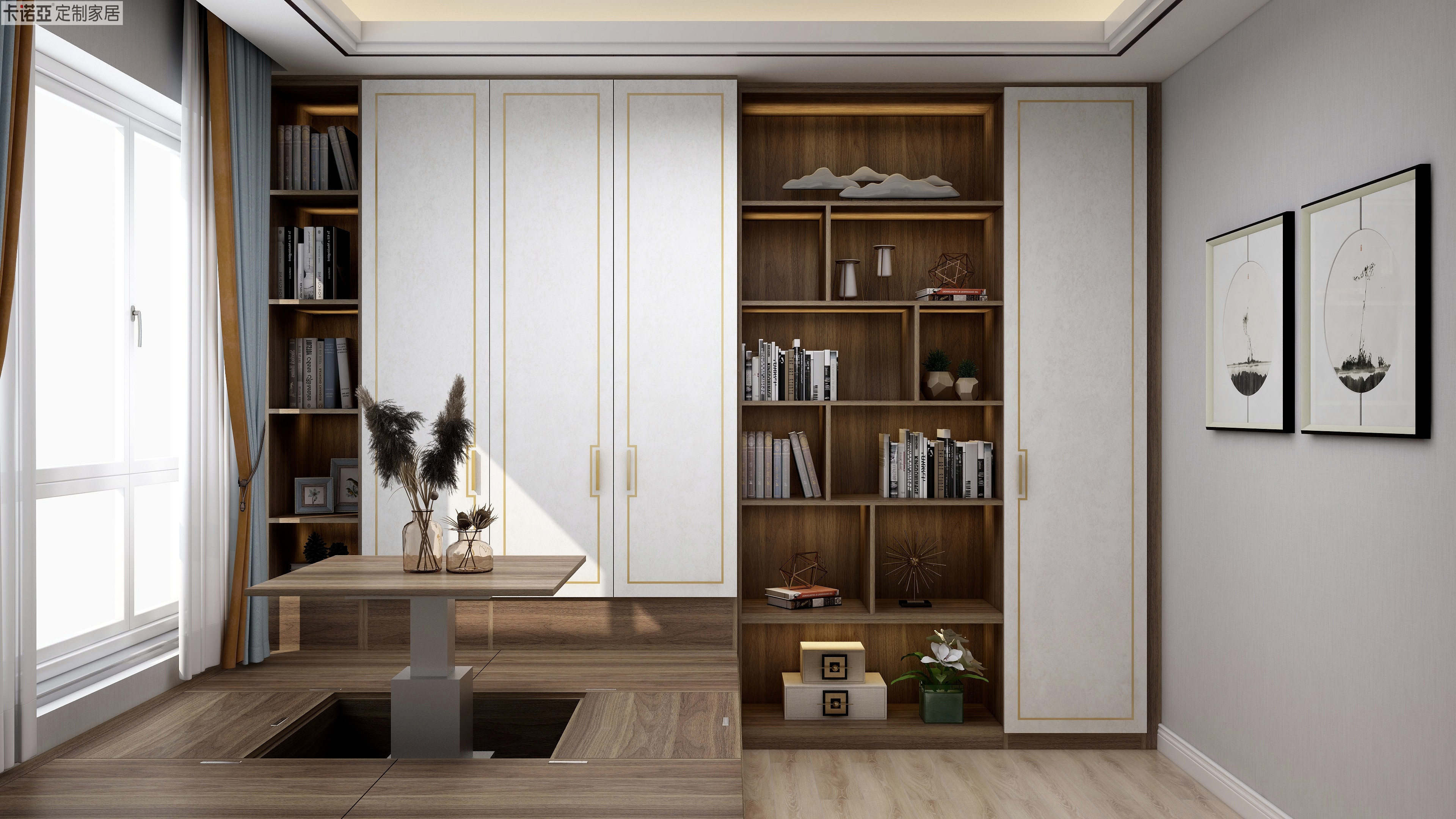 榻榻米是多功能房的不二之選,采用卡諾亞“御品木”的榻榻米,彰顯東方式書房的戀木情結。與榻榻米連為一體的書柜,柜門采用淺色花紋,表面同樣嵌入回紋型金屬條,加上金屬拉手的點睛,讓中式書房寧靜致遠中綻放優雅之美。