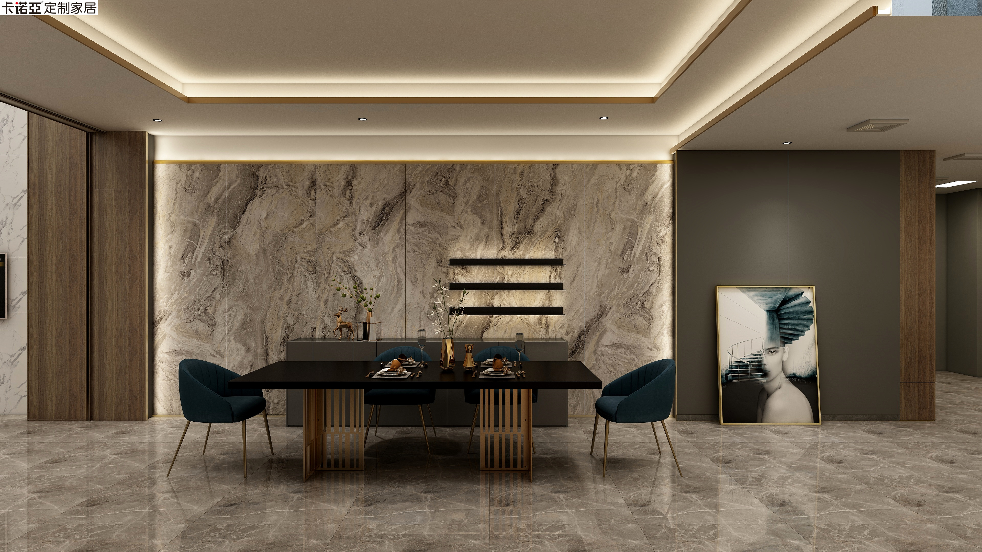 墻面“御品木×睿墨”溫柔的質感,碰撞3D裝飾畫“大漠孤煙”硬朗的石紋,極簡“睿墨”矮柜點綴,一起裝飾餐廳背景墻,簡約大方,豪氣頓生。修長的餐桌椅腿腳、墻面金屬擱板等輕奢元素點綴,打造尊榮的就餐儀式感。