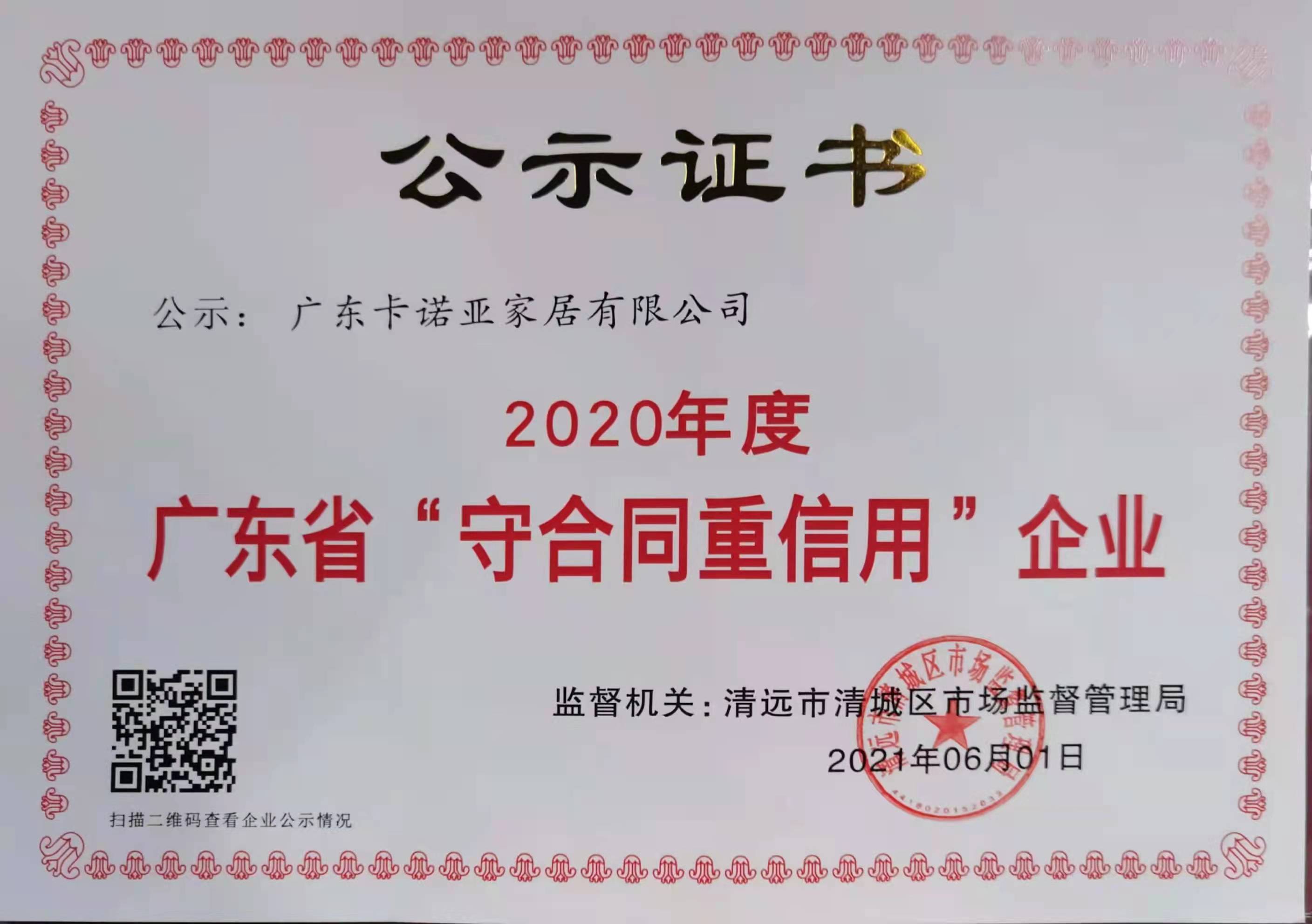 近日,廣東省清遠市清城區市場監督管理局對廣東省守合同重信用企業進行公示,卡諾亞專注定制家居20年,一直以來憑借企業自身完善的合同管理機制及良好的合同履約狀況等企業誠信信用體系,連續兩年榮獲廣東省“守合同重信用”企業稱號,這是對卡諾亞誠信守約的經營管理、優良的信用文化建設與良好的客戶口碑的肯定。