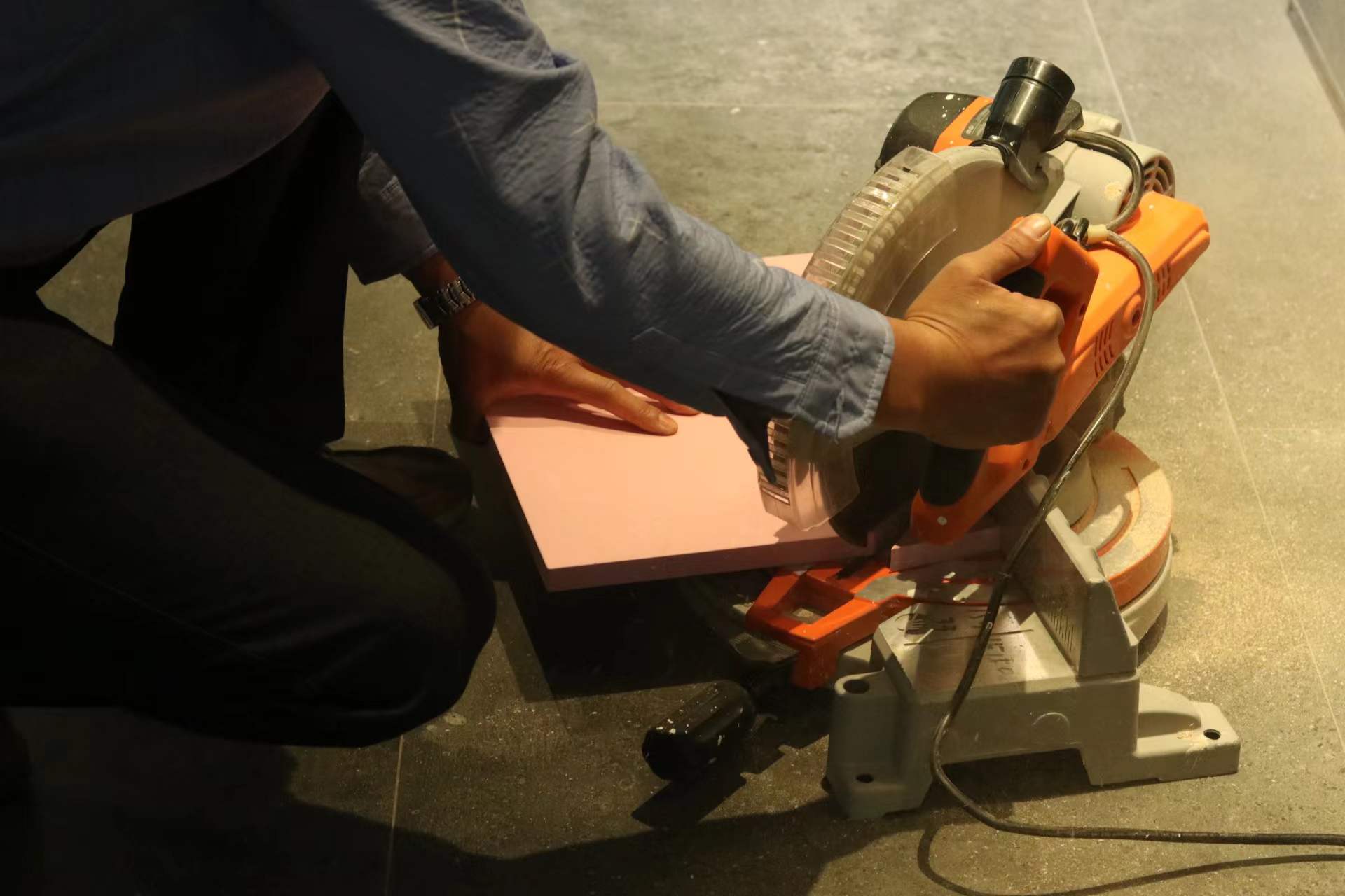 為測試康醛板的抗變形、防潮能力等,小編在現(xiàn)場進(jìn)行了多個實驗。測評現(xiàn)場,卡諾亞工作人員取出一塊完整的康醛板,并將其切割成小塊。可以看見,板材的切割口處紋理清晰,與普通顆粒板稍有不同。切割之后,板材并未釋放半點兒異味。
