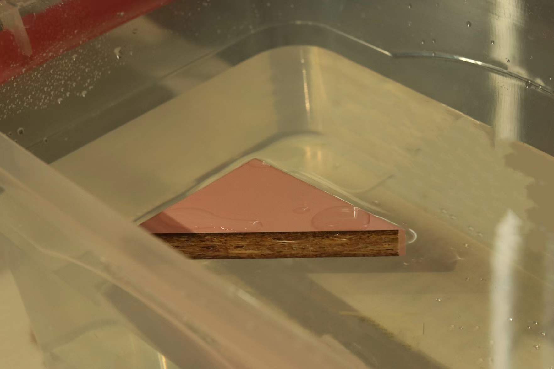 為檢驗板材防潮能力,小編將切割后的板材放入水中浸泡,幾個小時之后,將板材撈起發(fā)現(xiàn),看不出板材變形、膨脹,質(zhì)地依舊干燥且輕盈。這是因為康醛板使用原木木種顆粒,防潮性能強,加上聚氨酯粘合劑(MDI膠)是制造密封劑和防水涂料的原料,所以防水防潮能力相當(dāng)出色,更加適用于廚房等潮濕的空間。