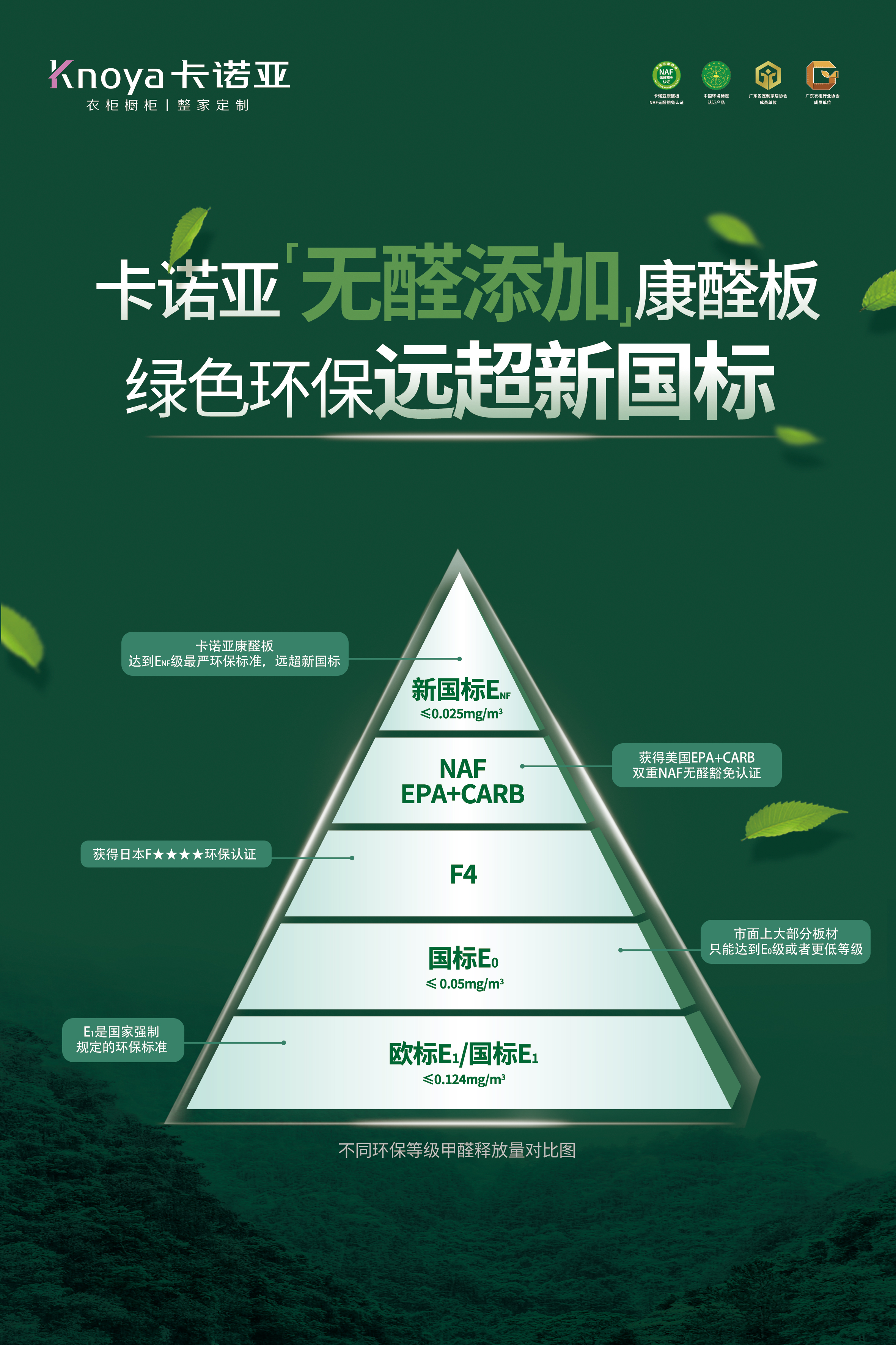 2021年10月1日實施新國標,將企業室內用人造板及其制品的甲醛釋放量分為三個標準,E1級甲醛釋放量為≤0.124mg/m³,E0級為≤0.050mg/m³,最嚴苛的ENF級為≤0.025mg/m³,國家對人造板環保品質提出了更高要求。卡諾亞推出的康醛板,經權威部門檢測,甲醛釋放量≤0.025mg/m³,達到了全球最嚴格的ENF級環保標準。