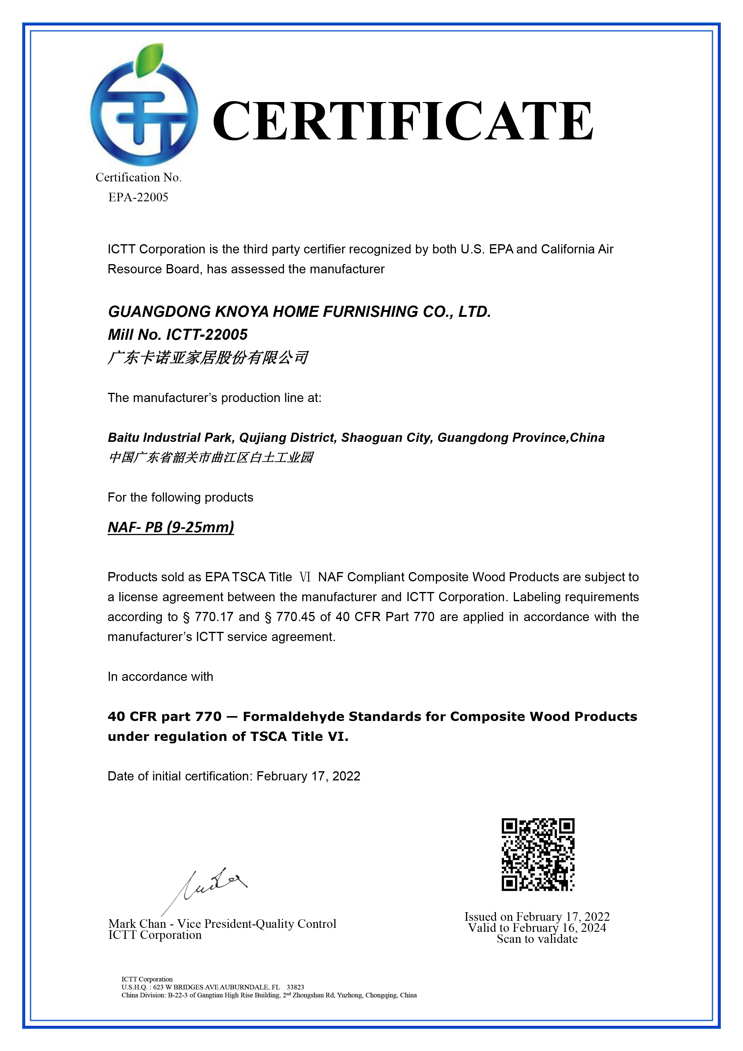 2022年3月,卡諾亞康醛板獲得全球至高級別的美國CARB-NAF無醛豁免認證、美國EPA-NAF無醛豁免認證。同年5月,卡諾亞再次突破環保標準新高度,獲得由日本國土交通省頒發的F★★★★認證證書。