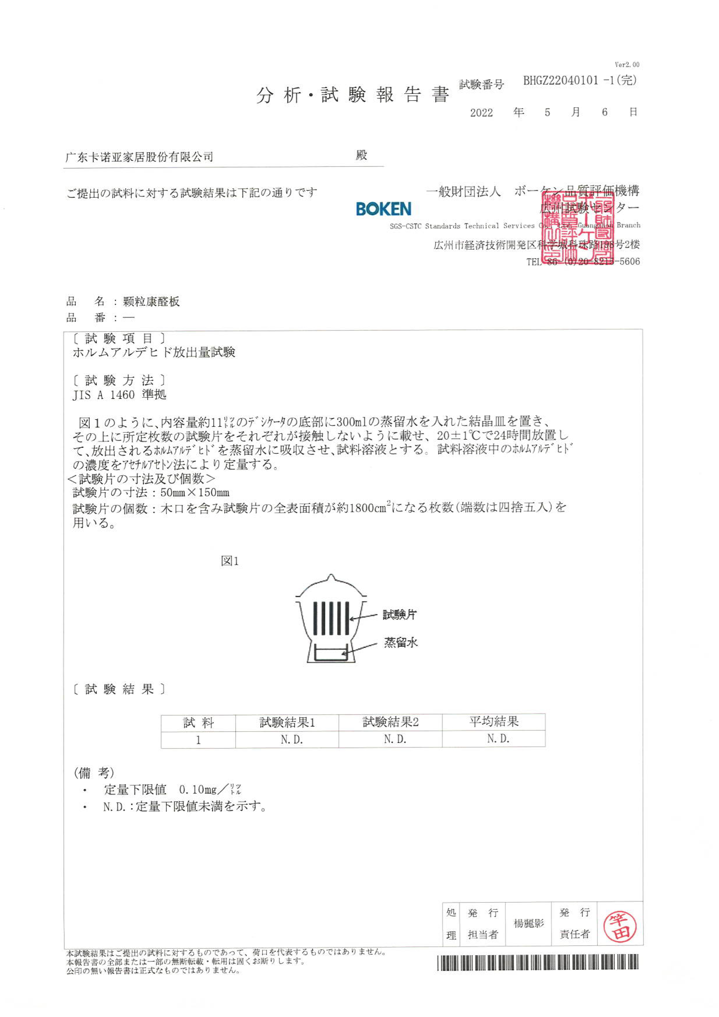 而F★★★★標準,依據來自日本國土交通省頒布的《建筑基準法》,是日本環保標準的健康等級,也是全球公認的對家居甲醛含量要求最嚴苛的標準之一。企業產品參與評定合格后,由日本國土交通省頒發證書。符合這個等級的建材產品甲醛釋放限量平均值要求不能超過0.3mg/L,且對于被檢產品要求檢測面積不小于0.18平方米。本次成功通過F★★★★認證,意味著卡諾亞康醛板的健康指標已達國際普遍認為的最高等級標準,也標志著卡諾亞的環保健康水平再次躍上新高度。