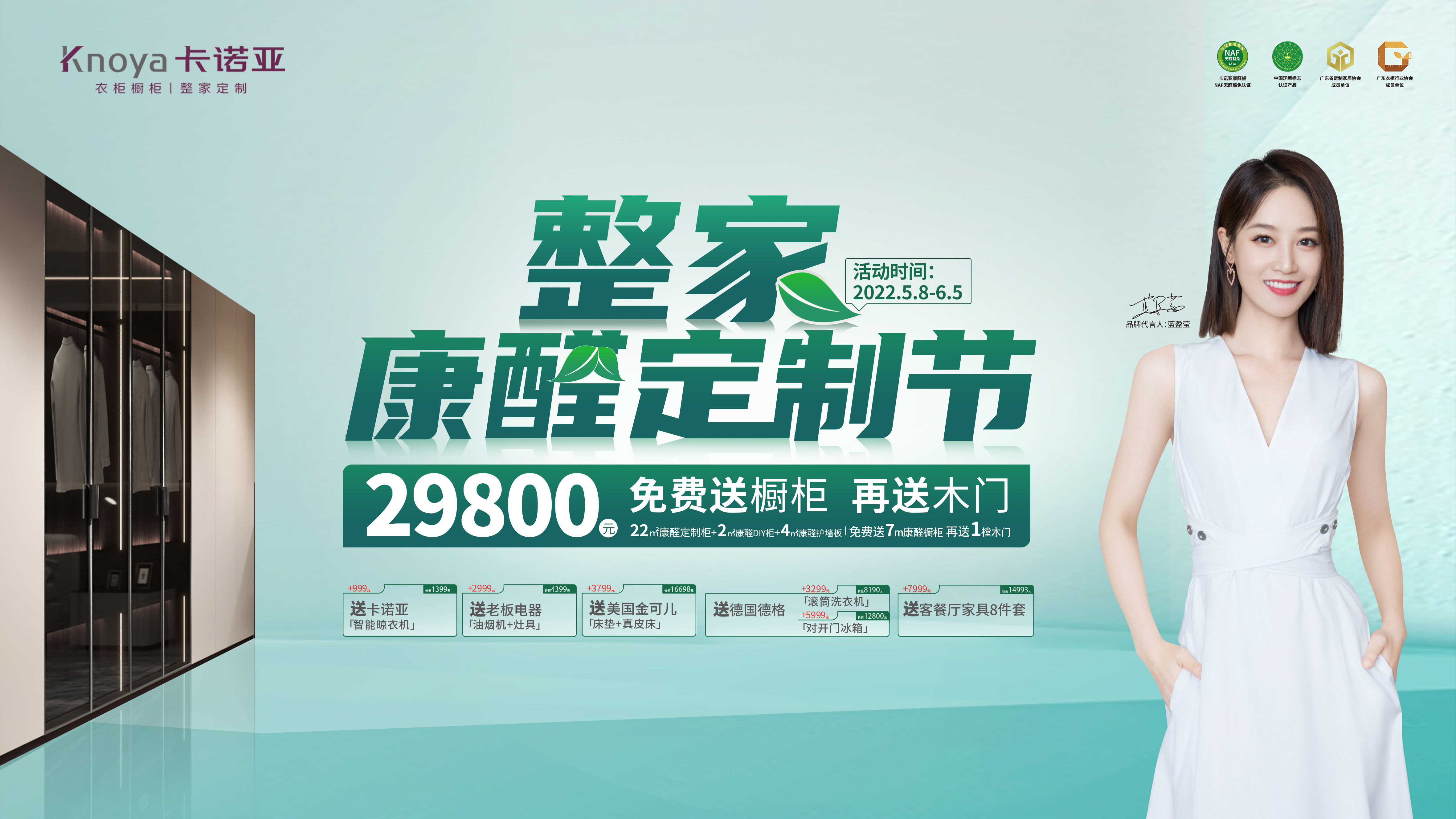 2022年5月8日-6月5日,卡諾亞在全國實力開展“整家康醛定制節”大型營銷活動,重磅推出新一輪環保硬核升級政策,整家康醛套餐¥29800包括22㎡康醛定制柜+2㎡康醛DIY柜+4㎡康醛護墻板,同時還免費送7m康醛櫥柜再送1樘木門,更有勁爆新品嘗鮮價、國際大牌家具家品、家電惠送等海量加碼福利,助力消費者輕松享受綠色家居。